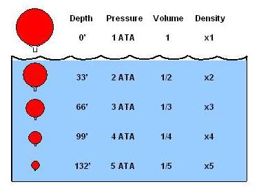 Example #1: Suppose you had a balloon containing 1 cubic foot of air at the surface of the water. This balloon is under 1 Atmosphere-Absolute (ATA) or 14.7 psi or 1 Bar (approx) of pressure. If we take the balloon underwater to a depth of 33 feet (10m), it is now under 29.4 psi (2 Bar) of pressure. Boyle's Law then tells us that since we have twice the pressure, the volume of the balloon will be decreased to one half. It follows then, that taking the balloon to 66 feet (20m), the pressure would compress the balloon to one third its original size, 99 feet (30m) would make it 1/4, etc.